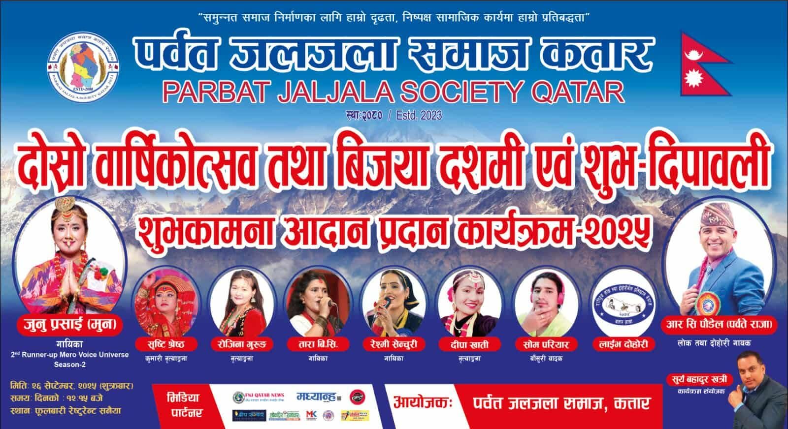 पर्वत जलजला समाज कतारले आफ्नो दोस्रो वार्षिकोत्सव तथा विजया दशमी–दीपावली शुभकामना आदान–प्रदान कार्यक्रम आयोजना गर्ने भएको छ। आगामी २६ सेप्टेम्बर २०२५, शुक्रबारका दिन सनैया स्थित फलवारी रेस्टुरेन्टमा हुने   कार्यक्रममा विभिन्न मनोरञ्जनात्मक साँस्कृतिक  प्रस्तुति रहने  कार्यक्रम संयोजक  सूर्यबहादुर खत्रीले बताए ।