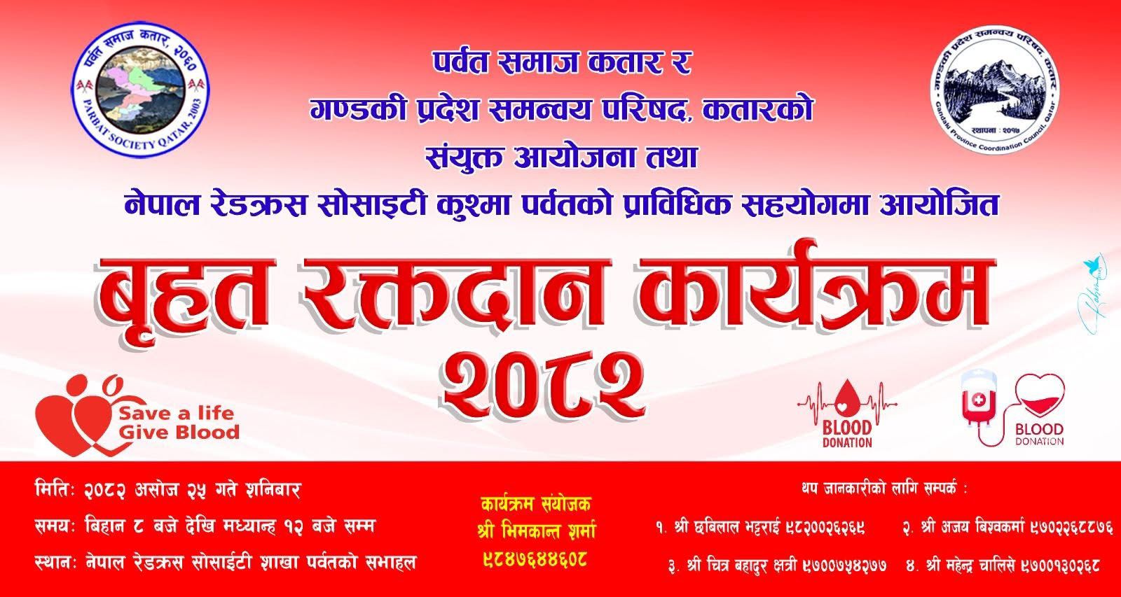 पर्वत समाज कतार र गण्डकी प्रदेश समन्वय परिषद् कतारको आयोजना तथा नेपाल रेडक्रस सोसाइटी पर्वतको प्राविधिक सहयोगमा पर्वत जिल्लाको सदरमुकाम कुश्मामा आगामी शनिबार बृहत रक्तदान कार्यक्रम हुने भएको छ।