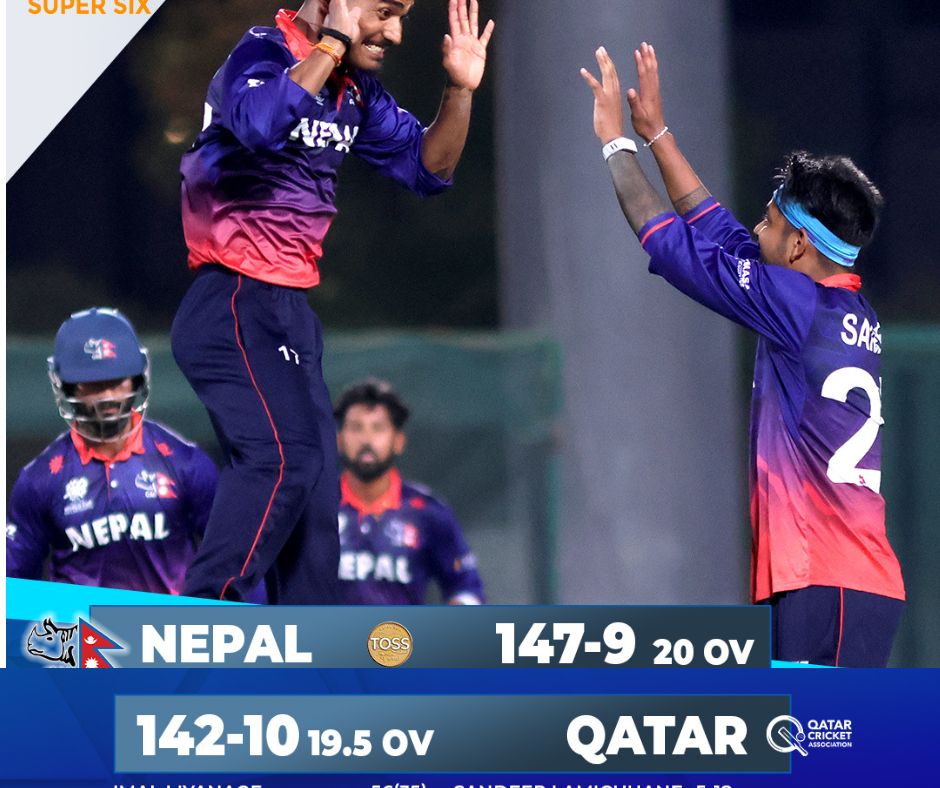 ओमान— आईसीसी टी-२० विश्वकप क्वालिफायर अन्तर्गतको सुपर सिक्सको महत्वपूर्ण खेलमा नेपालले कतारमाथि ५ रनको सनसनीपूर्ण जित निकाल्दै विश्वकप छनोटतर्फको यात्रा बलियो बनाएको छ। कप्तान रोहित पौडेलको कप्तानी पारी र स्पिनर सन्दीप लामिछानेको जादुई बलिङको मद्दतले नेपालले कडा टक्करको खेलमा कतारलाई पराजित गर्न सफल भयो।