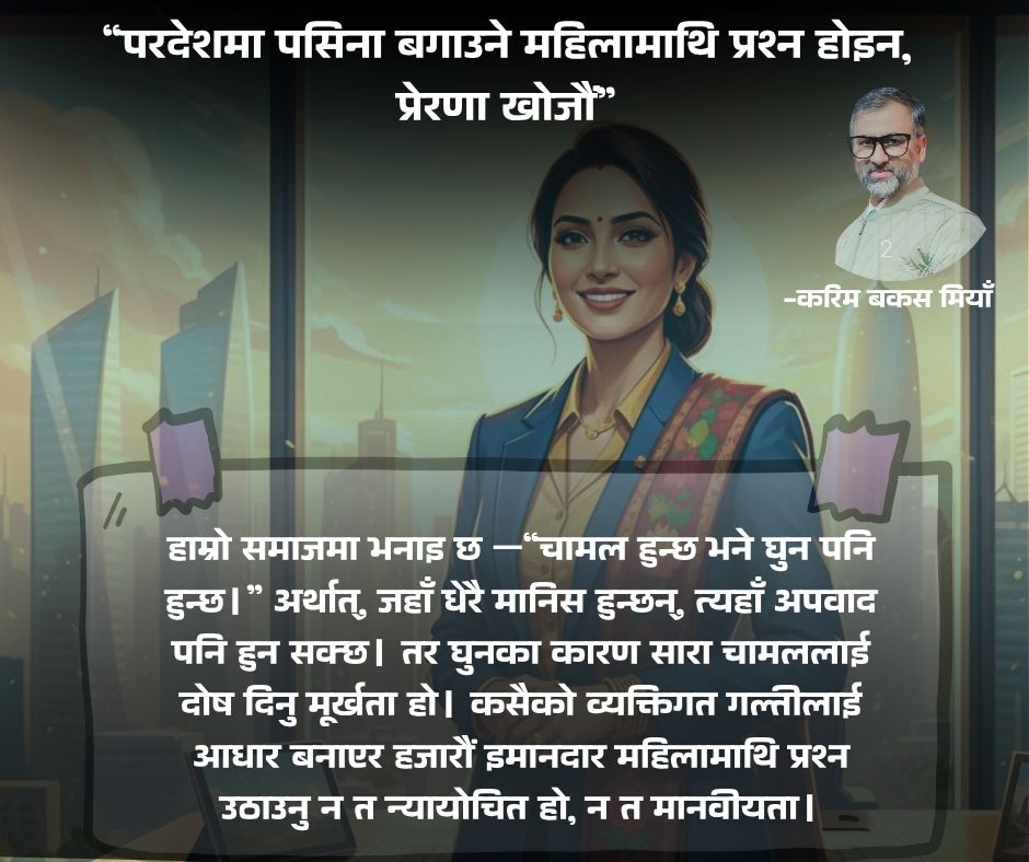 यसले केवल महिलाको आत्म–सम्मानमा आघात पुर्याउँदैन, बरु परदेशमा पसिना बगाउने लाखौं नेपाली महिला कामदारहरूको प्रतिष्ठा माथि पनि चोट पुर्याउँछ।