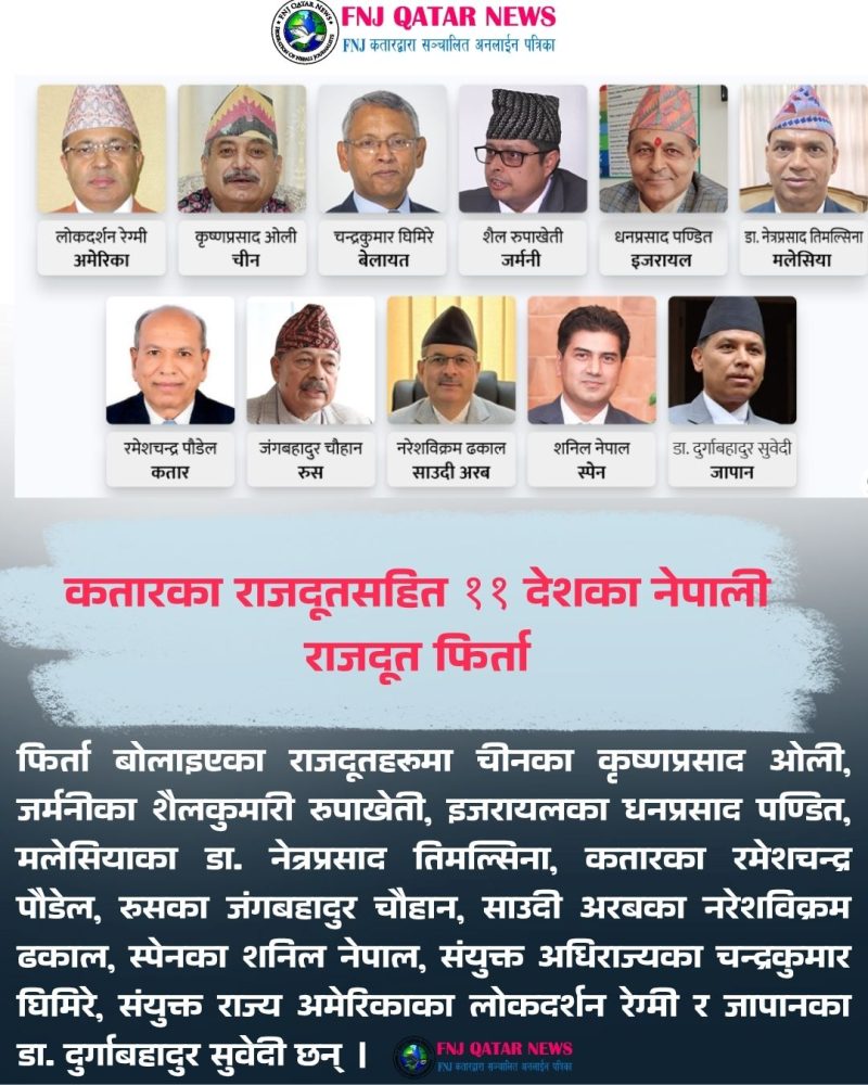 दोहा ,कतार। सरकारले केपी ओली नेतृत्वको सरकारले नियुक्त गरेका कतारका राजदूतसहित विभिन्न ११ देशका नेपाली आवासीय राजदूतहरूलाई फिर्ता बोलाउने निर्णय गरेको छ ।