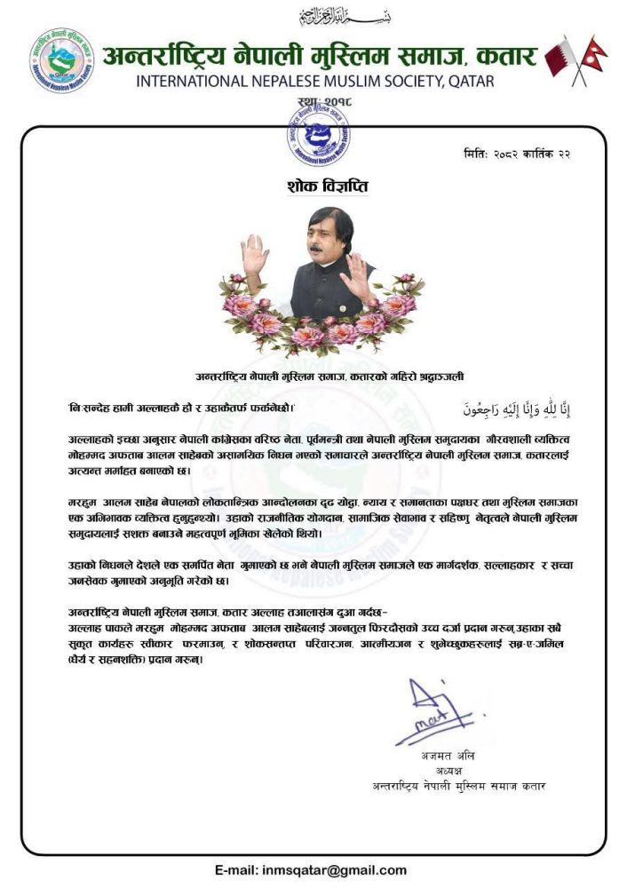 दोहा, कतार – २३ कात्तिक २०८२ (९ नोभेम्बर २०२५) । अन्तर्राष्ट्रिय नेपाली मुस्लिम समाज, कतारले नेपाली कांग्रेसका वरिष्ठ नेता, पूर्वमन्त्री तथा नेपाली मुस्लिम समुदायका प्रखर योद्धा मोहम्मद आफताब आलमको निधनमा गहिरो शोक व्यक्त गरेको छ।