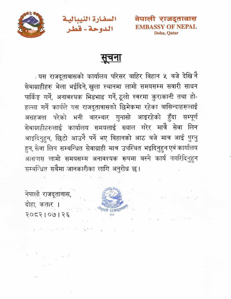 दोहा । नेपाली राजदूतावास, दोहाले कार्यालय समयअघि दूतावास परिसर तथा वरपर अनावश्यक भीडभाड नगर्न सेवाग्राहीहरूलाई आग्रह गरेको छ।