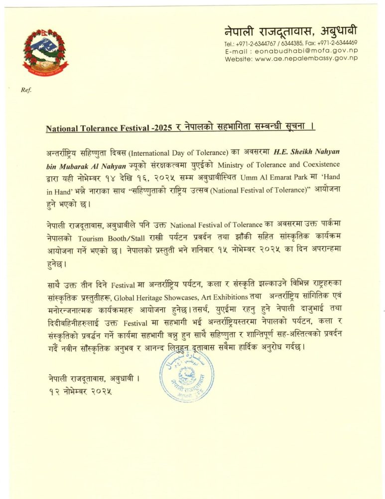 अन्तर्राष्ट्रिय सहिष्णुता दिवसको अवसरमा युएईको सहिष्णुता तथा सहअस्तित्व मन्त्रालय (Ministry of Tolerance and Coexistence) ले महामहिम शेख नह्यान बिन मुबारक अल नह्यानको संरक्षकत्वमा यही नोभेम्बर १४ देखि १६, २०२५ सम्म अबुधाबीस्थित उम्मुल एमारात पार्कमा “सहिष्णुताको राष्ट्रिय उत्सव-२०२५ आयोजना गर्ने भएको छ।