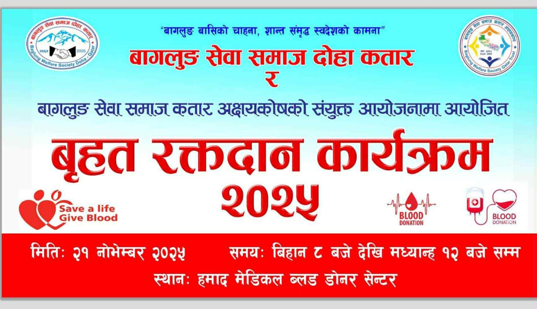 दोहा । बागलुङ सेवा समाज दोहा कतार र बागलुङ सेवा समाज कतार अक्षयकोषको संयुक्त पहलमा आगामी २१ नोभेम्बर २०२५ मा दोहास्थित हमाद मेडिकल ब्लड डोनर सेन्टरमा बृहत् रक्तदान कार्यक्रम आयोजना हुँदैछ। “रक्तदान जीवनदान, जीवनदान महादान” भन्ने मूल मन्त्रका साथ अघि सारिएको यो सामाजिक अभियानले कतारमा रहेका नेपाली समुदायबीच मानवता, परोपकार र सामाजिक उत्तरदायित्वलाई प्रवर्द्धन गर्ने लक्ष्य राखेको आयोजकले जनाएको छ।